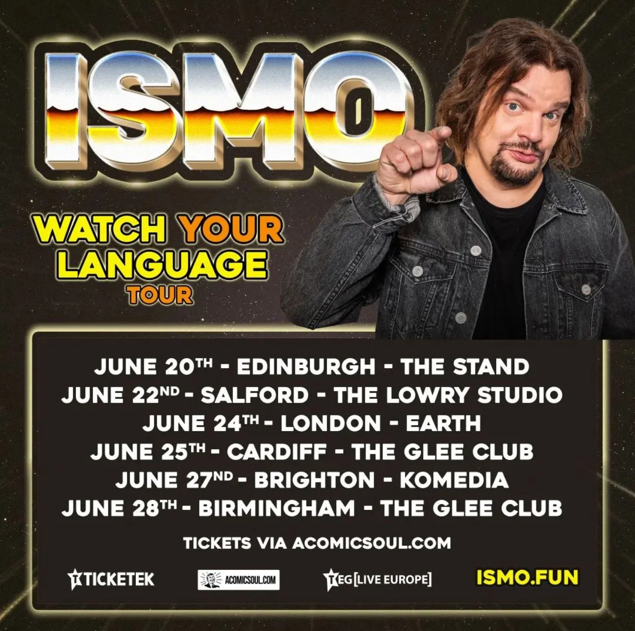 A graphic for Ismo, a comedian and client of mine at LMG. I did all the planning, copywriting and posting for his IG, TikTok, YouTube and Facebook. I worked with a designer to conceptualize the graphics, and edited his standup clips myself. I also handled website editing, online tour promotions, ad placements and analysis.